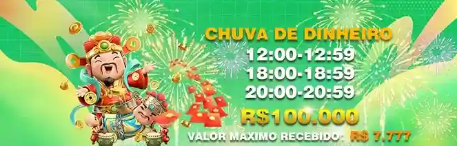 A promoção Chuva de Dinheiro acontece em horários específicos (12:00–12:59, 18:00–18:59 e 20:00–20:59), distribuindo prêmios que podem chegar a R$ 100.000, com valor máximo recebido de R$ 7.777, oferecendo múltiplas oportunidades para os jogadores ganharem dinheiro real de forma divertida e surpreendente.